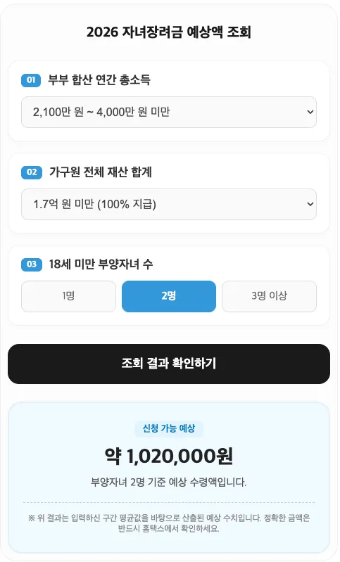 26년5월1일 자녀장려금 100만원 신청 방법입니다. 먼저, 아래에 소득을 입력하고, 결과 확인 버튼을 눌러주세요.